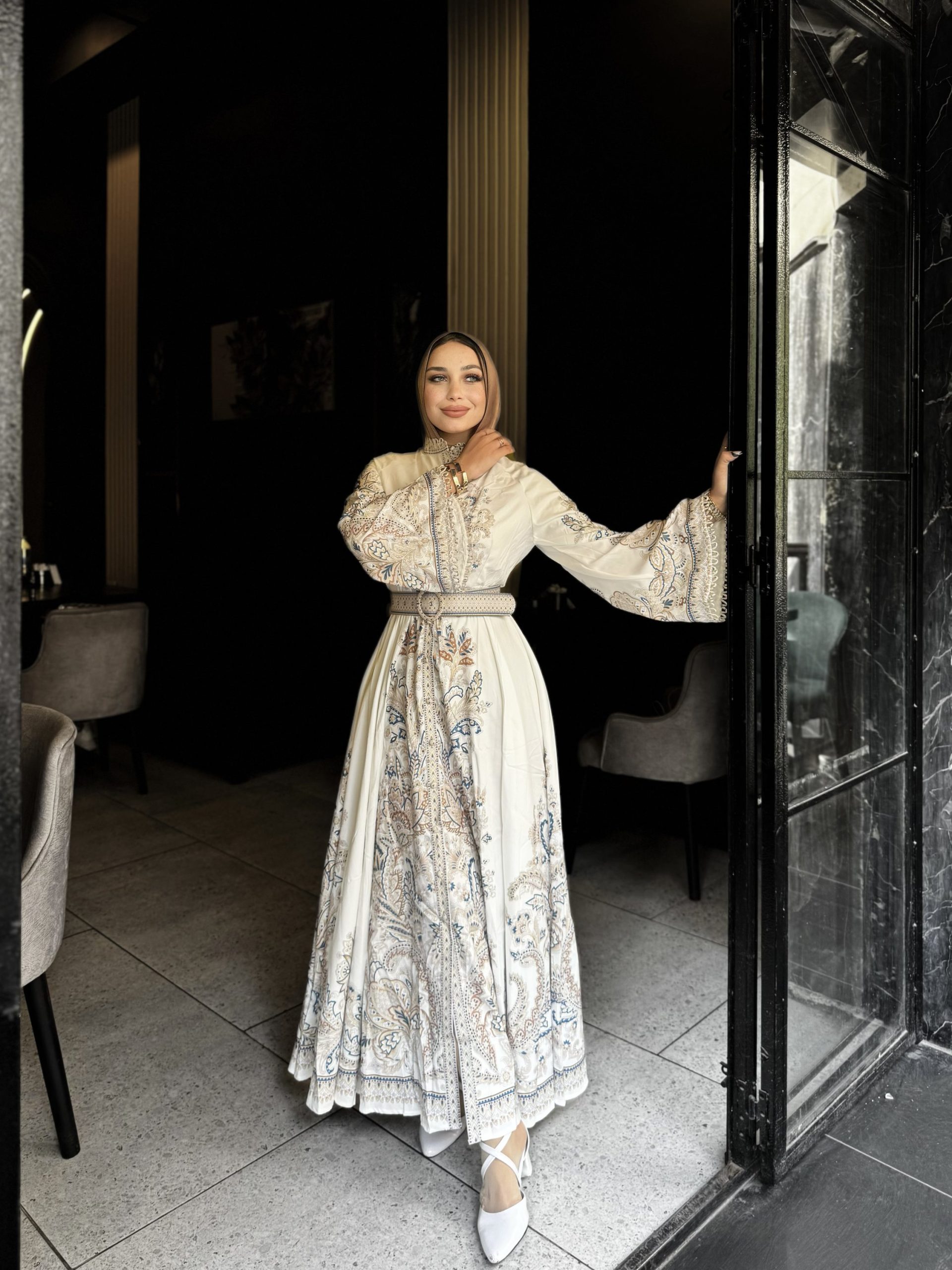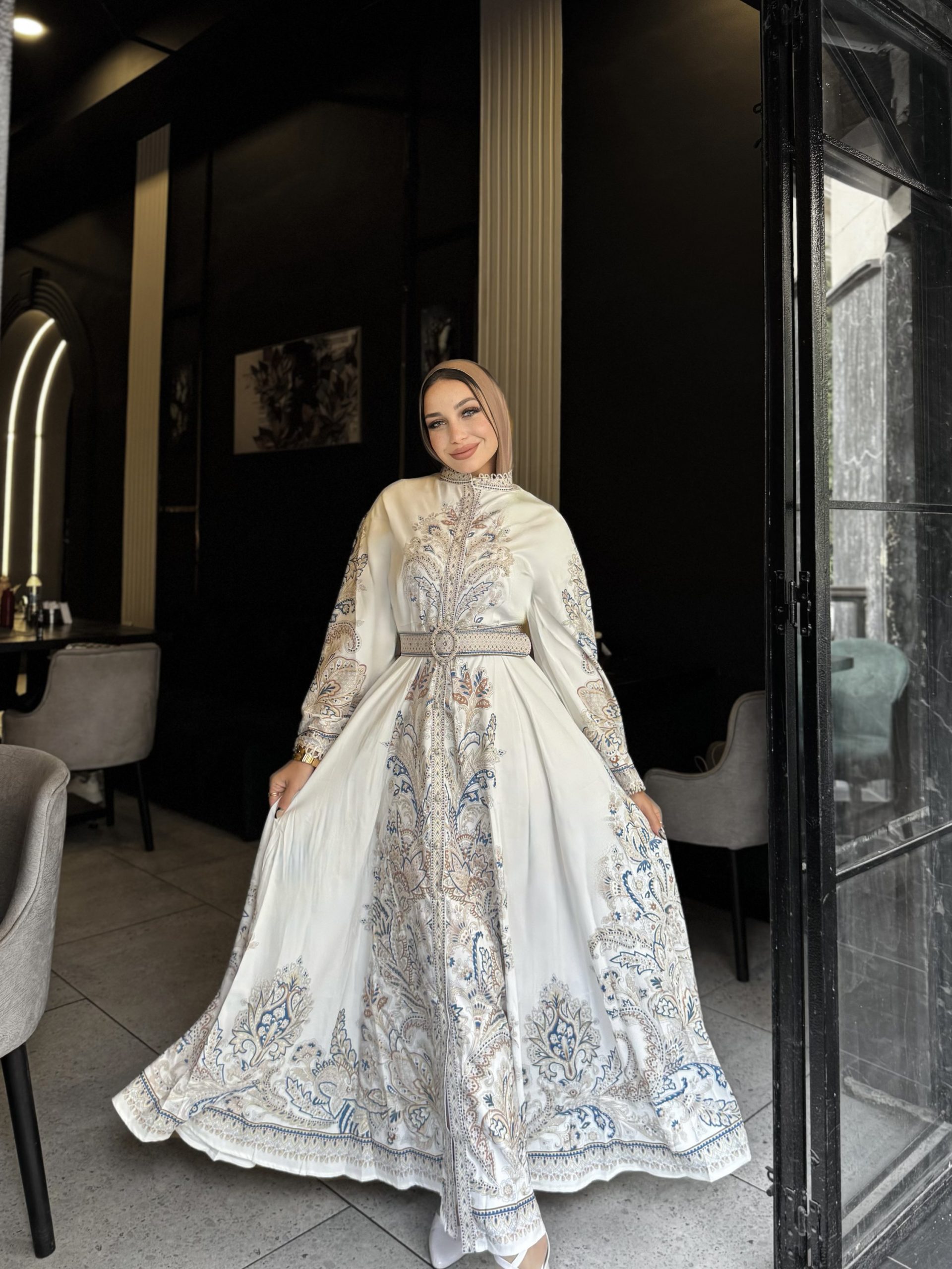 عرض الكتف ٣٩ محيط الصدر بالدوران ٩٢ سم محيط الخصر ٧٢. طول الكم ٥٧. طول الفستان ١٤٢ سم